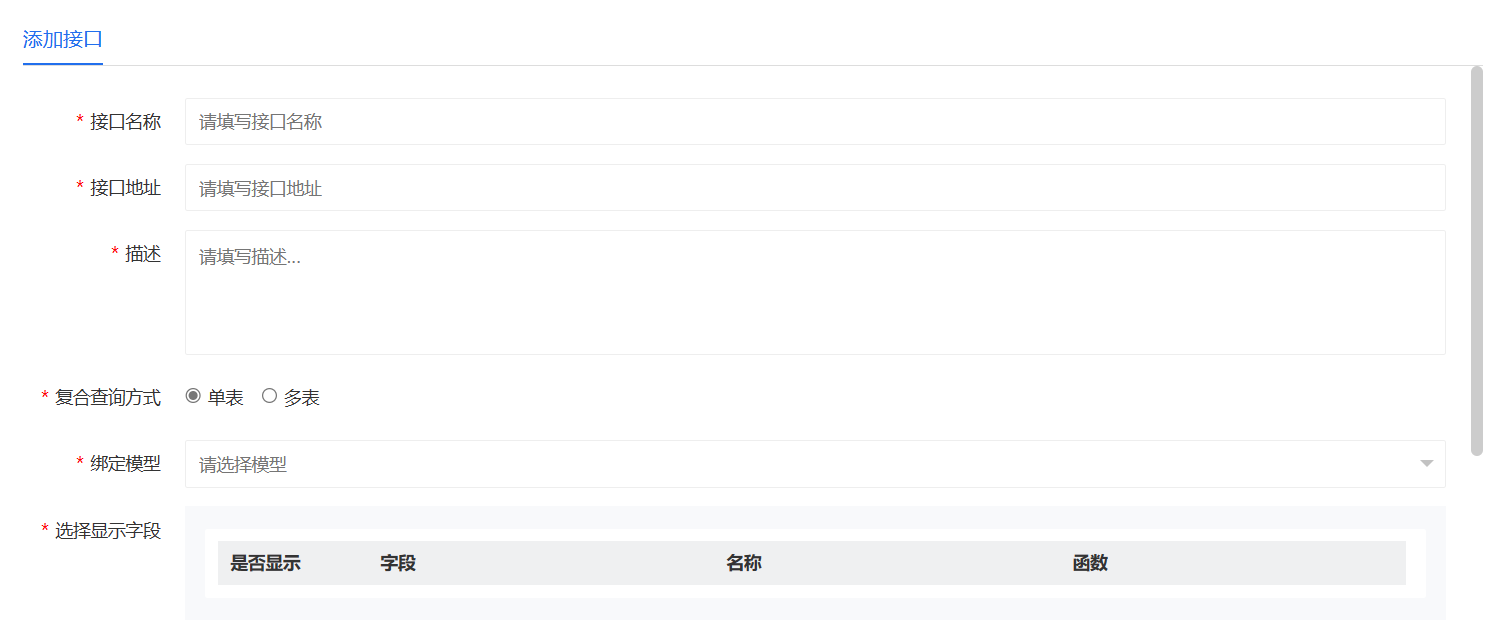 添加页面,进行填写接口名称、接口地址、描述、复合查询方式、选择绑定模型、选择显示字段、设置查询条件、选择排序字段及方式、日志类型等。