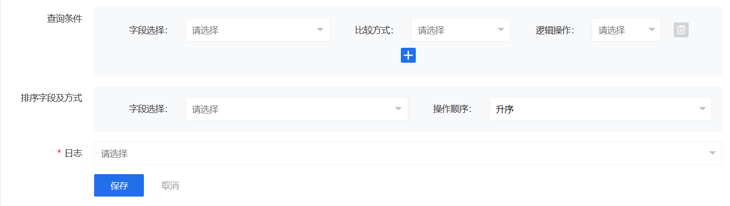 查询条件可为空,但字段选择、比较方式、逻辑方式选项需保持一致性:都为空或都不为空