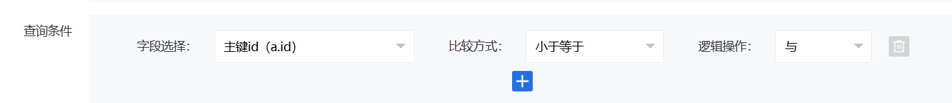 访问接口参数为:添加接口时,所选择的查询条件,若查询条件如下图,传参为:a.id=xxx(即可查询a.id小于等于xxx的数据)