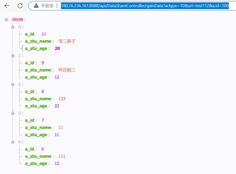 浏览器直接访问示例:180.76.236.161:8088/api/DataShareController/gainData?actype=10&url=test112&a.id=100