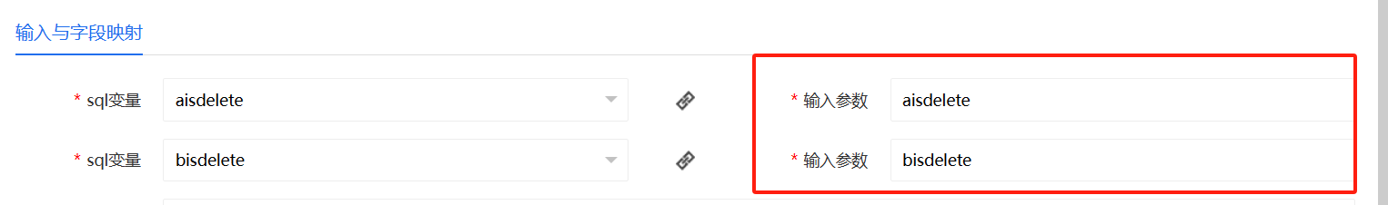 输入与字段映射中sql变量为sql语句编写时的动态变量名称,输入参数为访问接口时传参的参数名称(默认与sql变量相同,可根据需求自行更改)