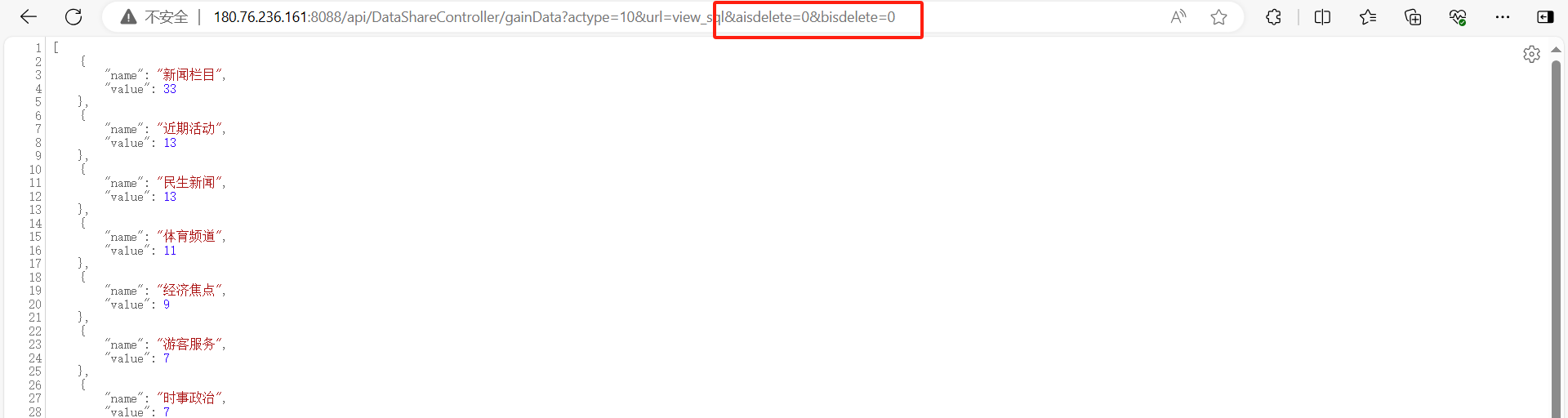 浏览器直接访问示例:180.76.236.161:8088/api/DataShareController/gainData?actype=10&url=view_sql&aisdelete=0&bisdelete=0
