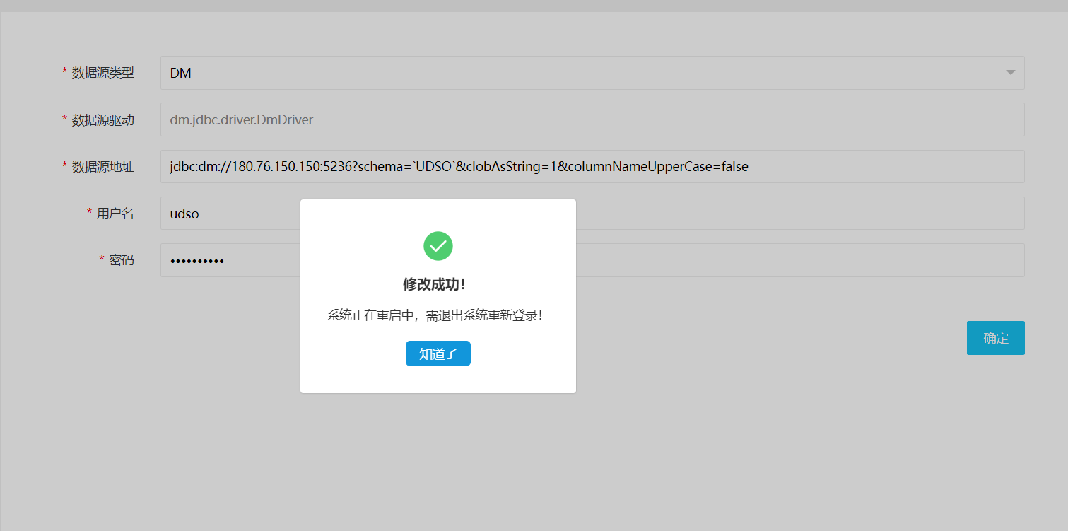 数据源信息修改成功后,重启项目进行应用新数据源,需重新登陆以更新数据信息。点击《知道了》退出登录返回登陆页进行重新登陆。