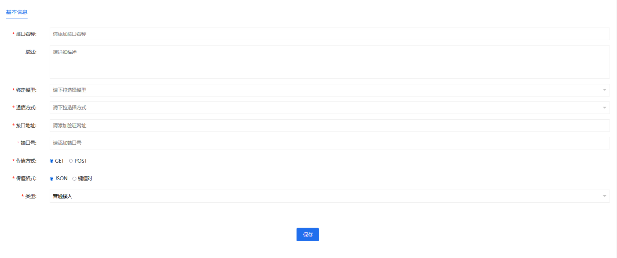 - 普通接入类型填写接口名称、接口描述、绑定模型、通讯方式、接口地址、端口号、传输方式、接口类型等;