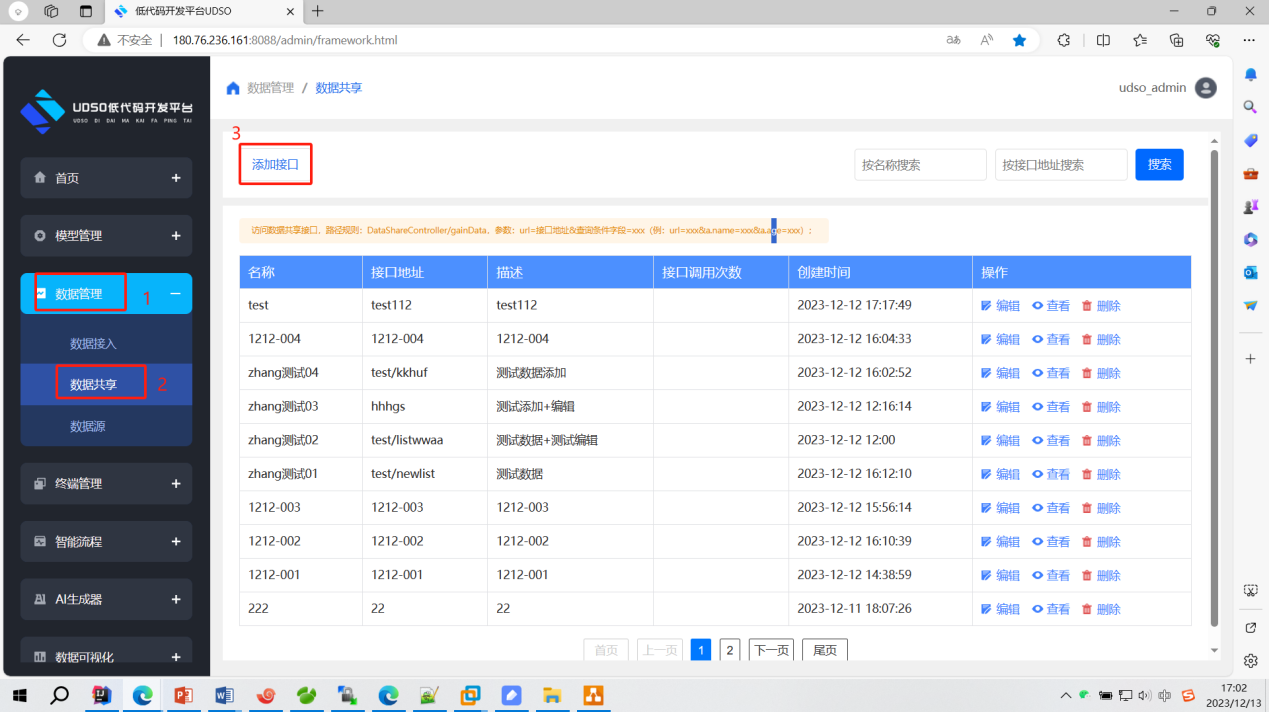 点击菜单数据管理->数据共享->添加接口。跳转到添加界面: