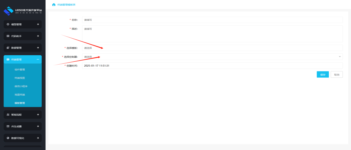 Ⅱ添加模板:点击”添加“进入到添加终端管理模板页面,添加所有必填内容(有类似模板和控制器可直接选择,无类似模板和控制器可自行添加模板操作步骤见《Ⅲ添加模板》,《Ⅳ添加控制器》点击完成后即可在“终端管理/终端视图/添加中选择本模板”。