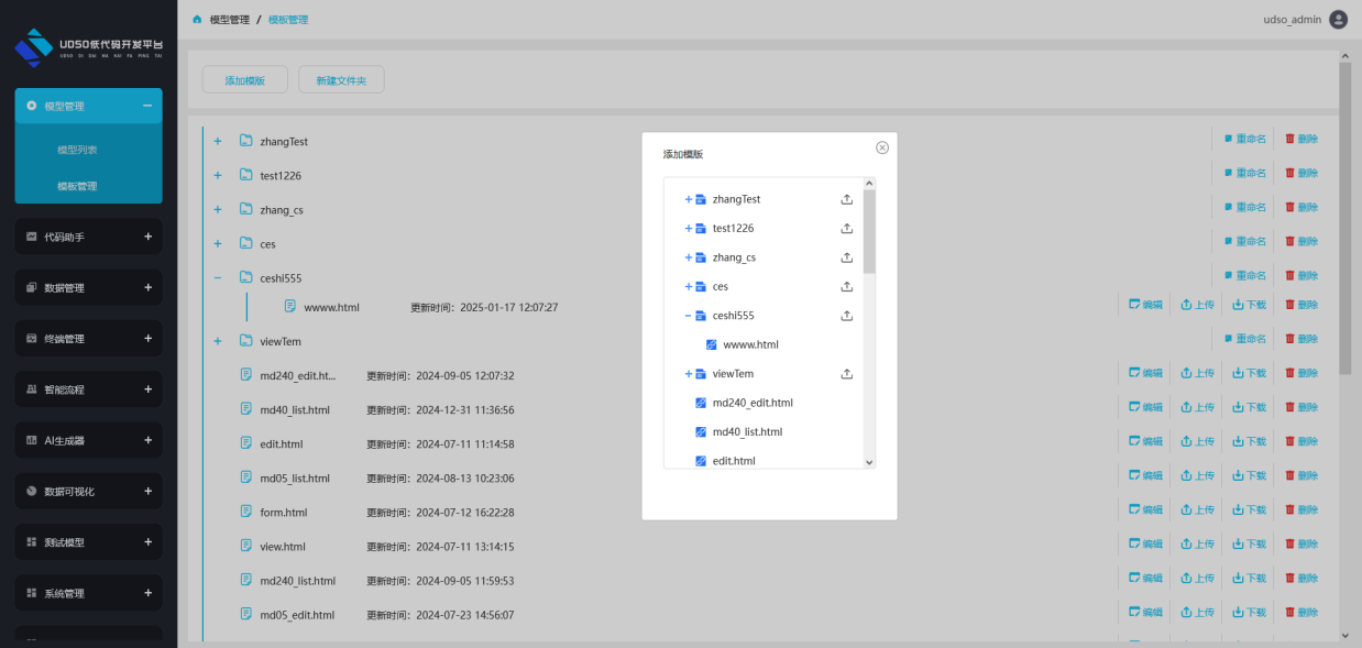 Ⅲ添加前端模板:点击“模型管理/模板管理/添加模板“,在对应的文件夹中上传自己模板文件,上传完成后可对模板进行编辑修改,确定保存操作既可在模板管理中添加本前端模板