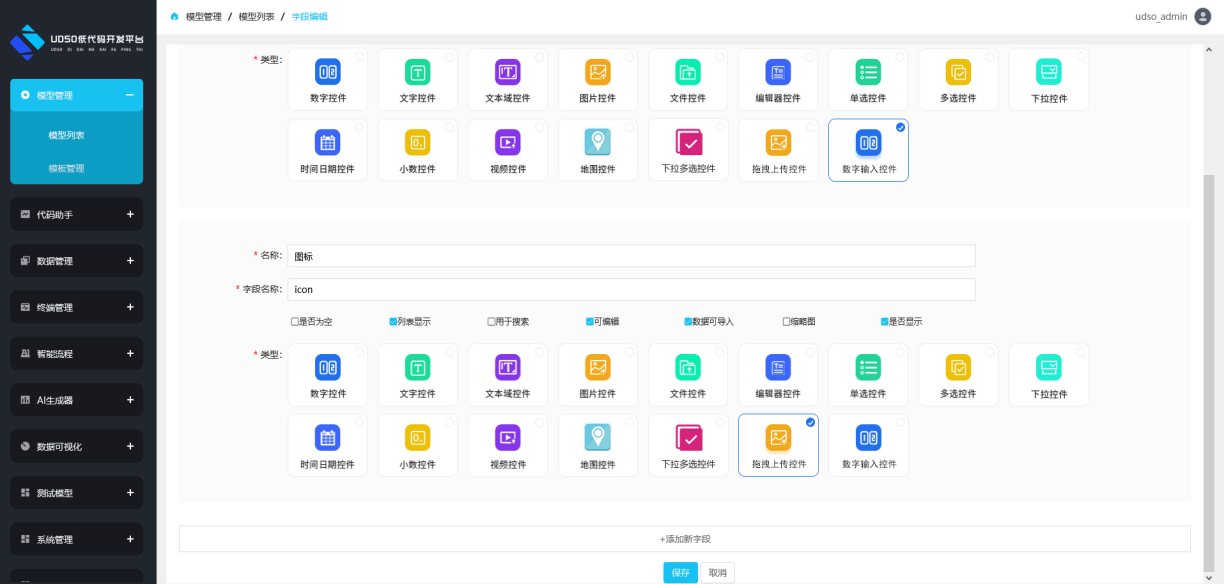 Ⅴ添加模型:点击模型管理/模型列表/添加模型,添加必填表标识、表名称等内容如图3,保存后,在对应模型中点击字段编辑如图4,添加表中对应的字段完成后点击保存按钮。保存完成后点击生成则可以在添加控制器中选择该模型。