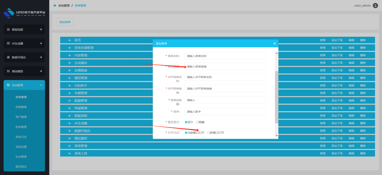 Ⅵ添加菜单:在系统管理/菜单管理/添加菜单中将终端生成的页面链接复制到菜单链接项,并选择打开方式(支持当前窗口打开和新页面打开),填写完成后进行保存。