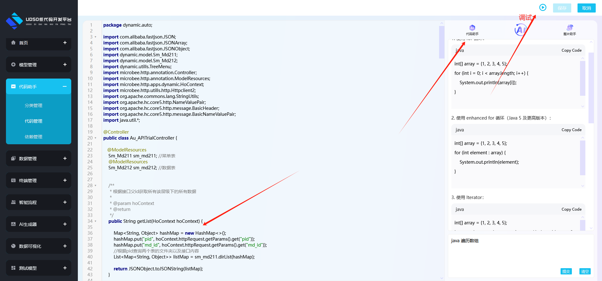 代码助手:当遇到不太明白的技术时可使用本系统AI助手智能回答,将其回答的内容复制到编辑器中进行调试使用。
