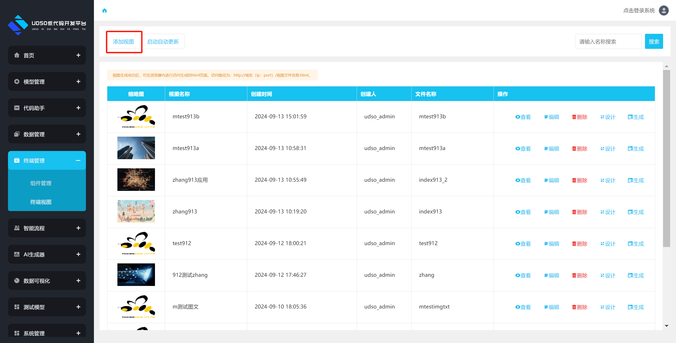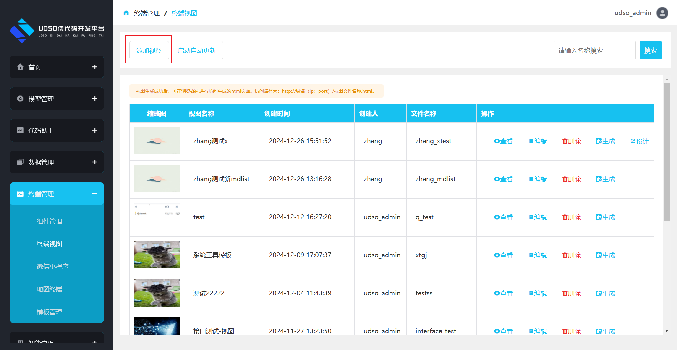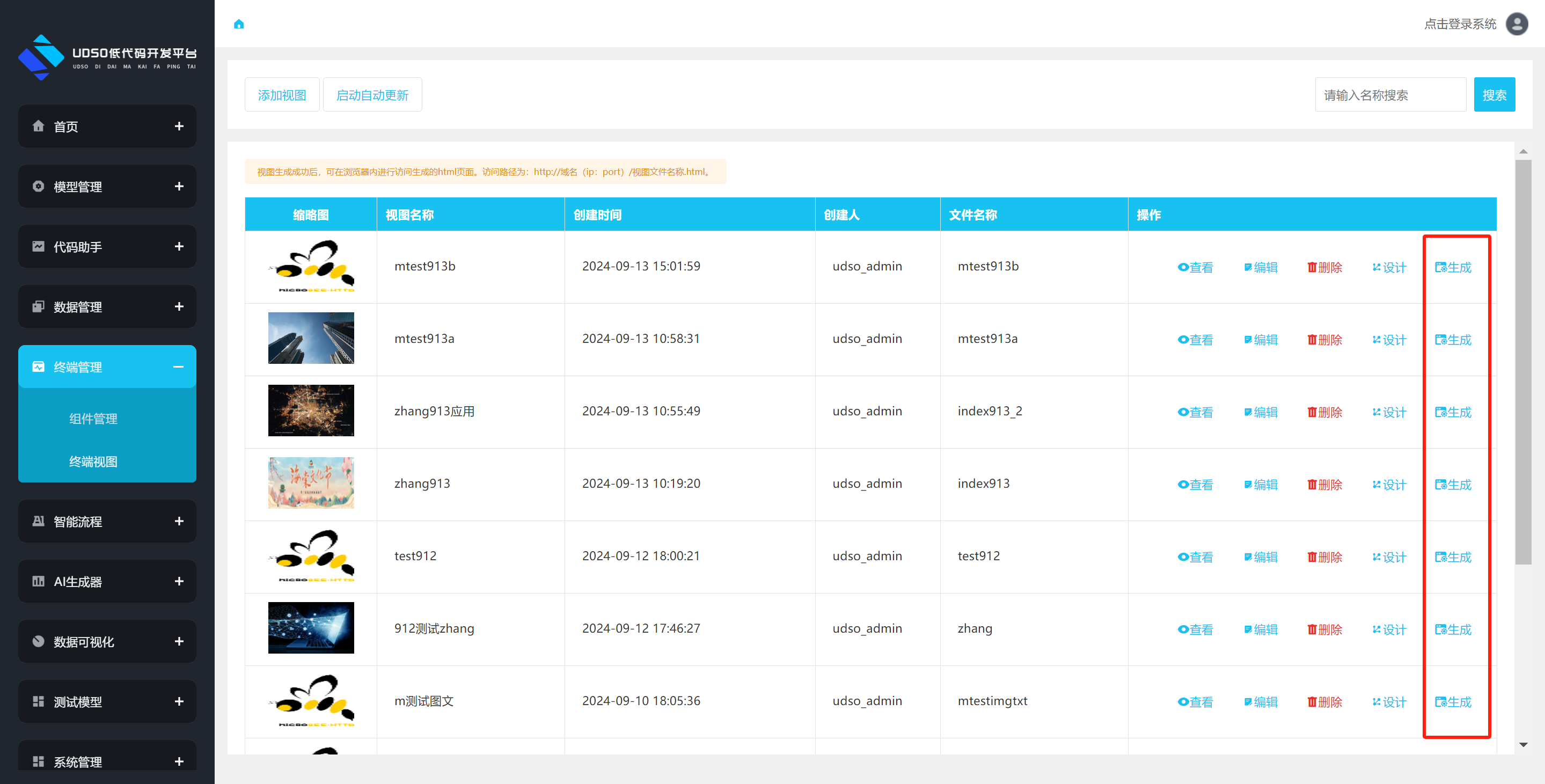 点击左侧菜单终端管理->终端视图。进行跳转到终端视图列表页面,点击数据操作栏中的生成按钮,进行生成html页面操作。