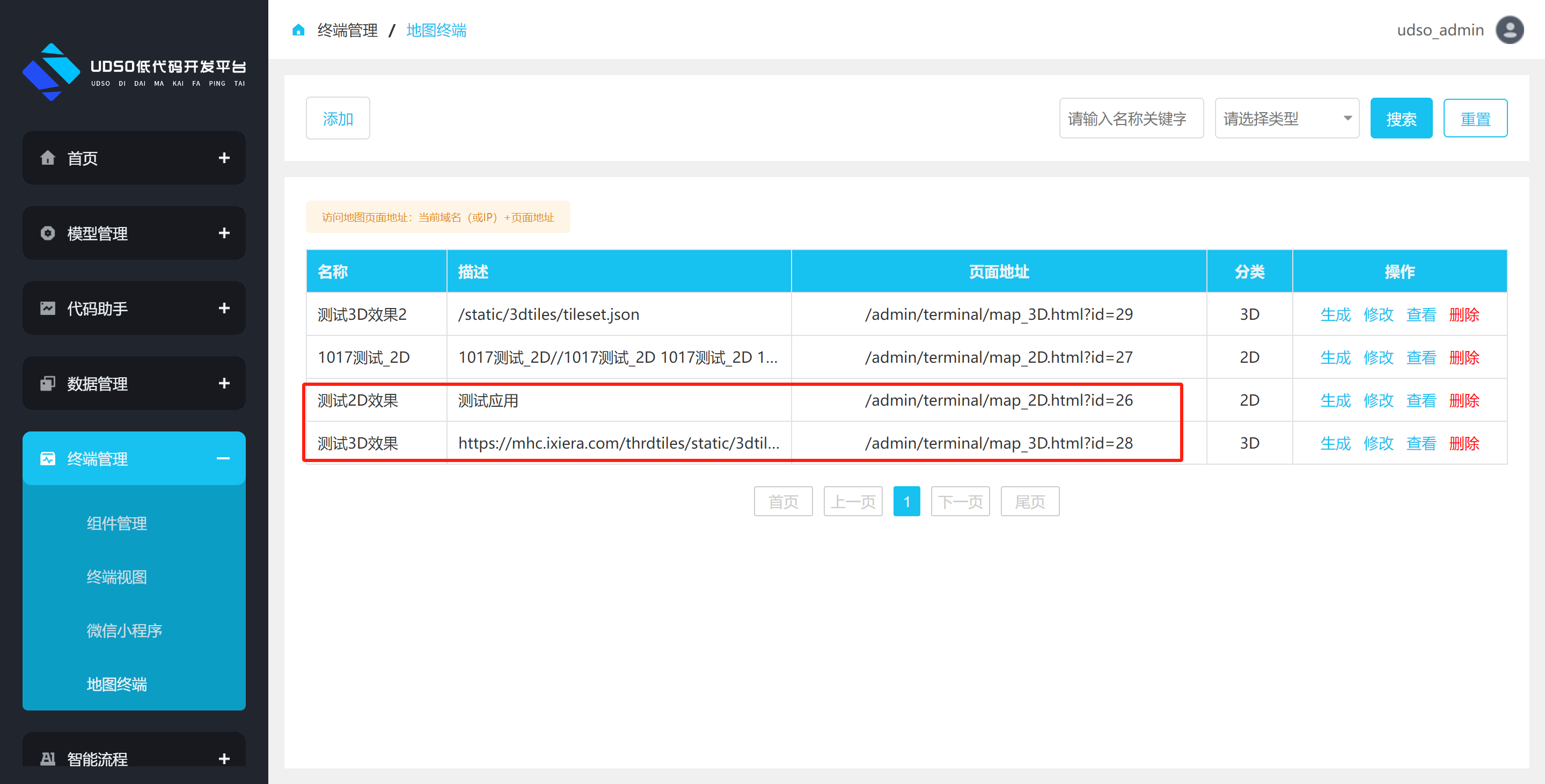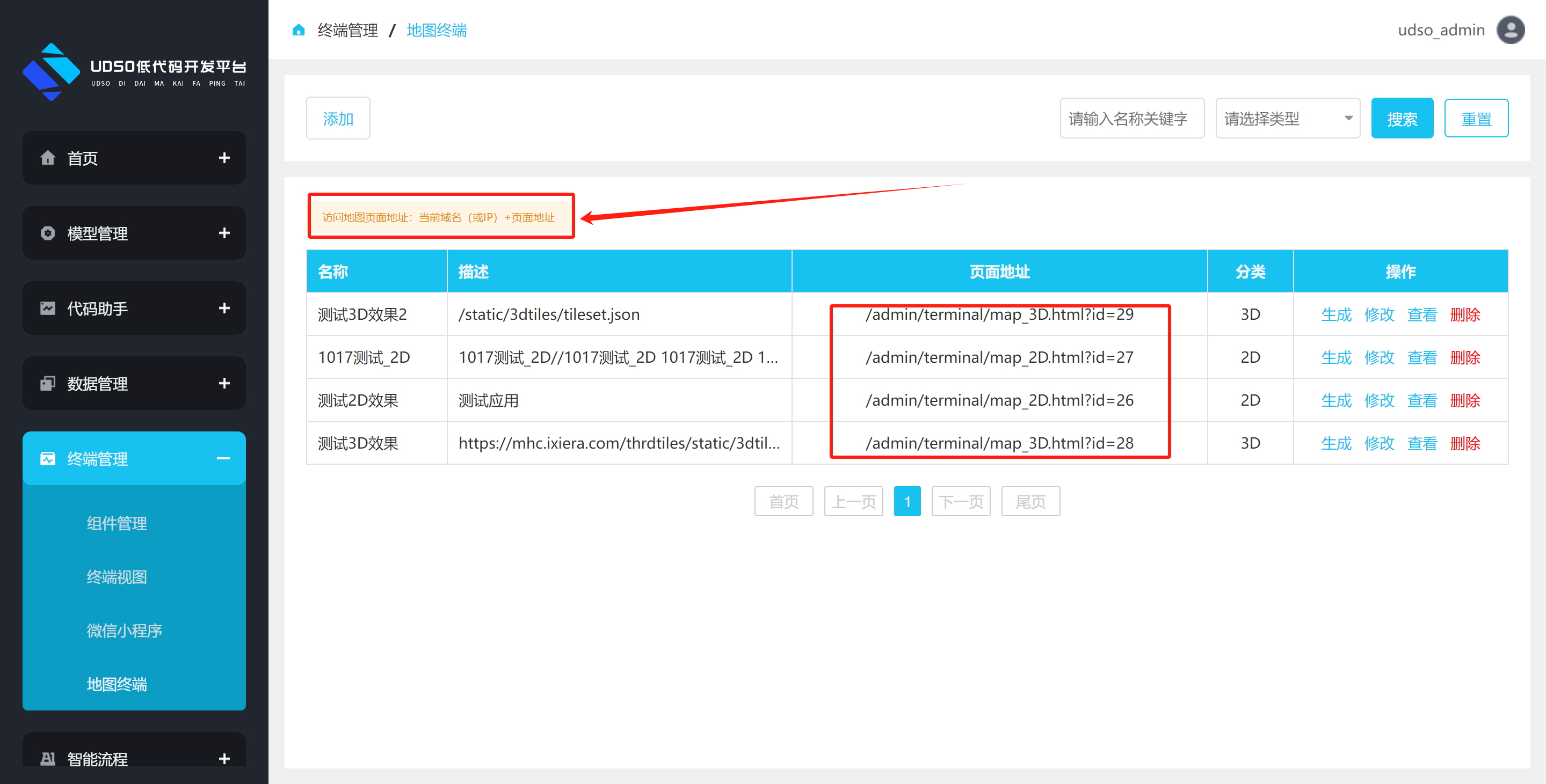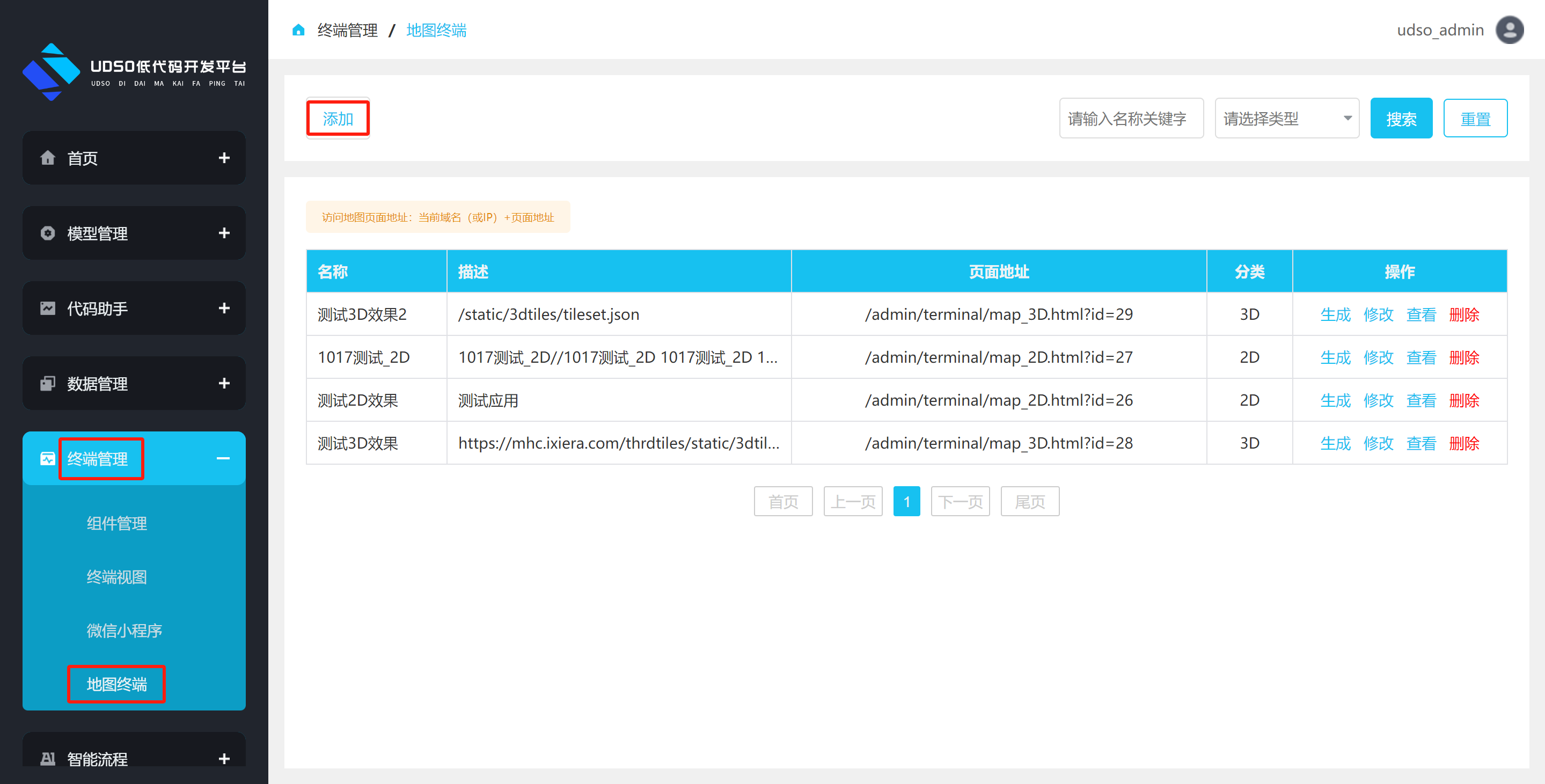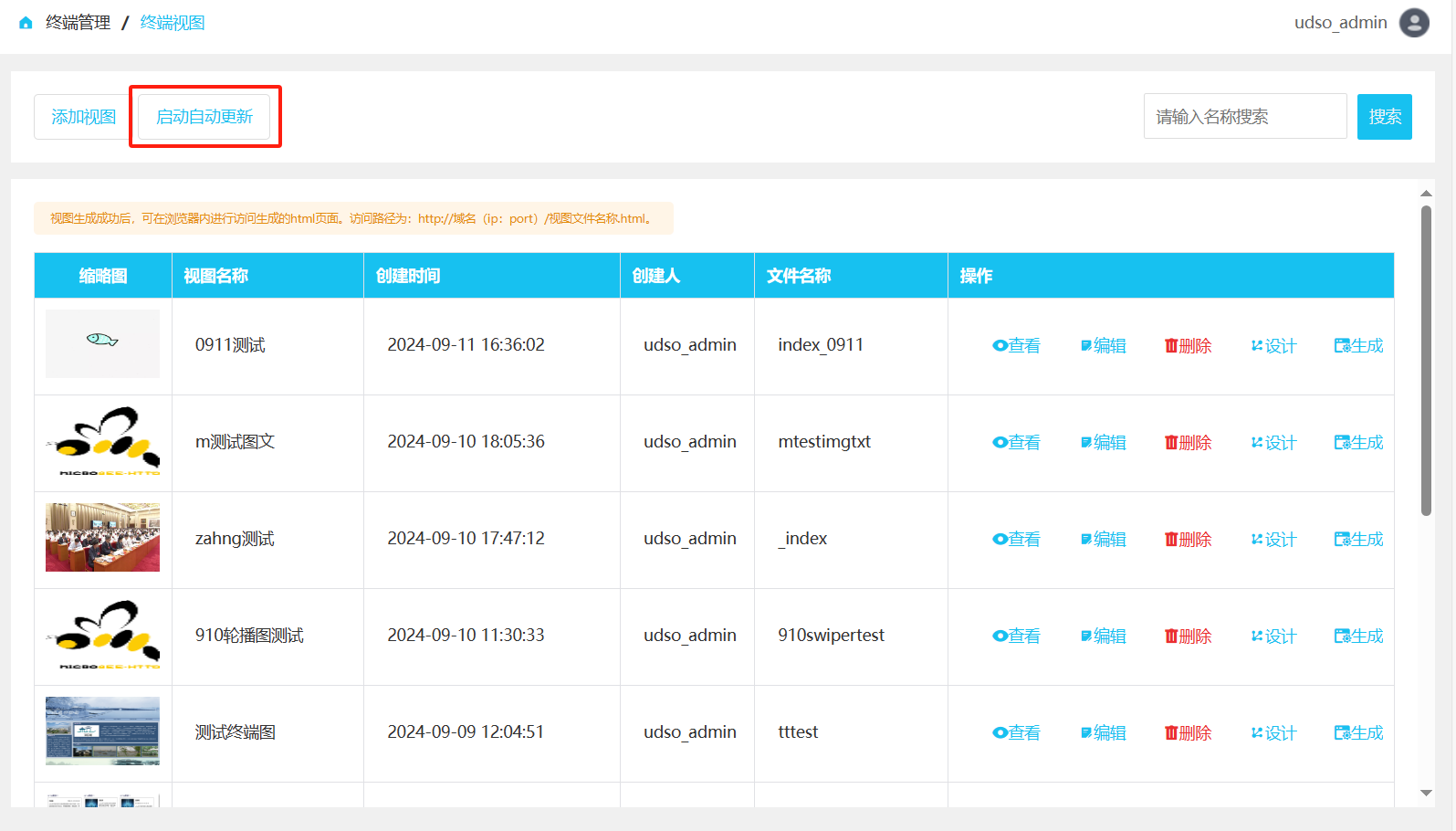 点击左侧菜单终端管理->终端视图。进行跳转到终端视图列表页面,点击数据操作栏中的生成按钮,进行生成html页面操作。