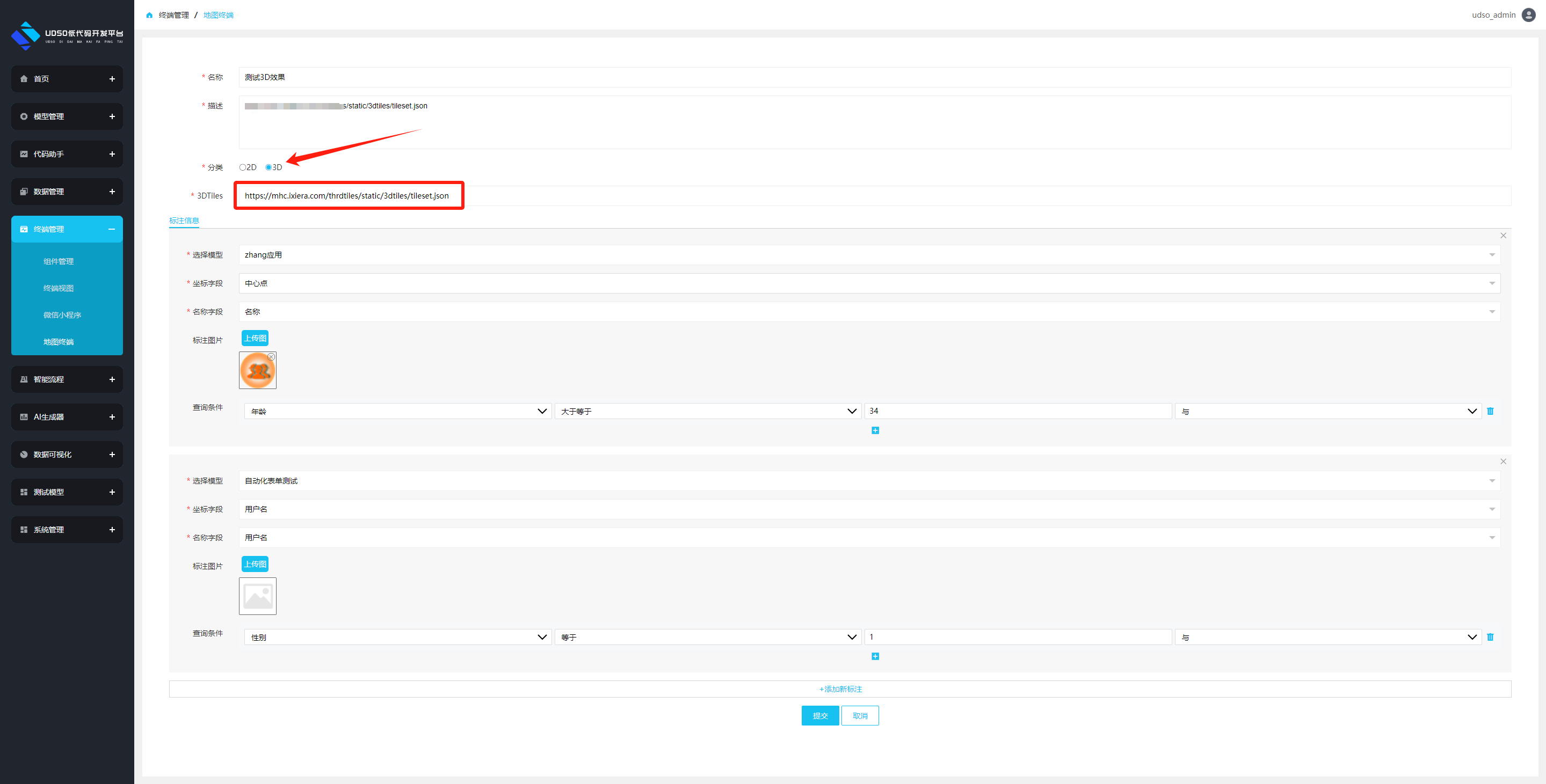填写表单时,分类选择3D则需要填写3DTiles模型json文件路径地址(上图中所示);