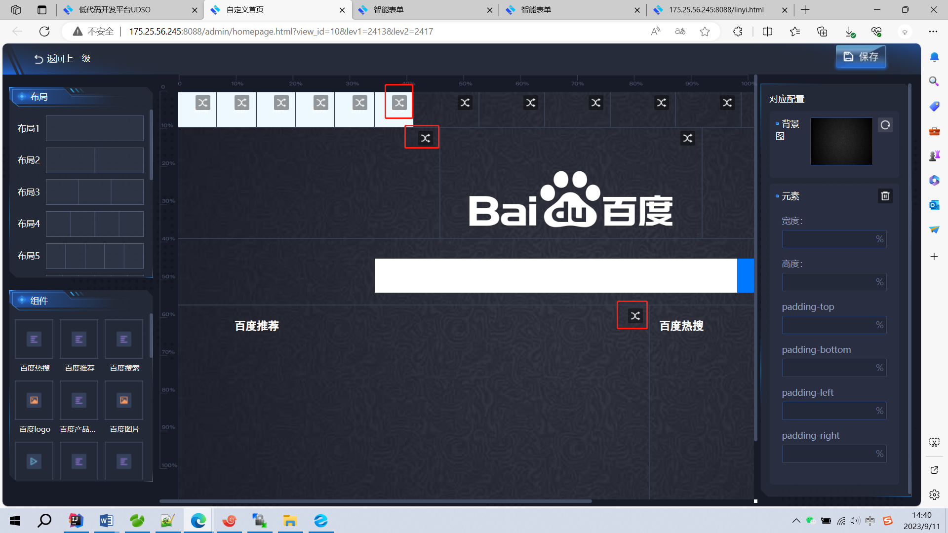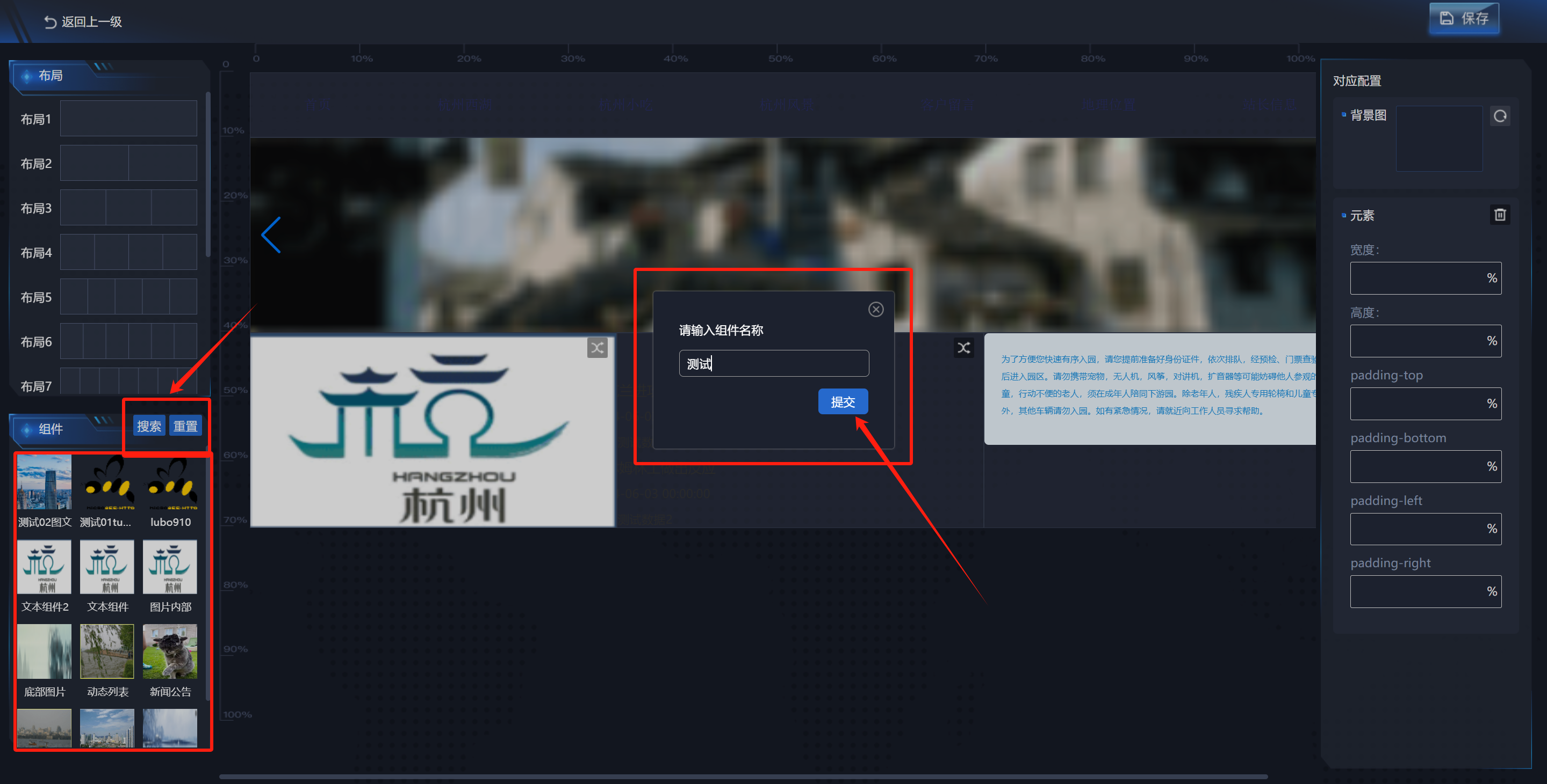 视图设计页面,可对页面进行背景图、布局以及布局填充设计。拖动左侧布局到页面,,再进行拖动组件填充到对应布局内(点击布局选择按钮(图中标记处按钮)可进行选择组件,可对布局进行宽度、高度等设置或删除操作;点击两次可对该布局内的组件进行操作。)。设计完成后点击右上角保存按钮。