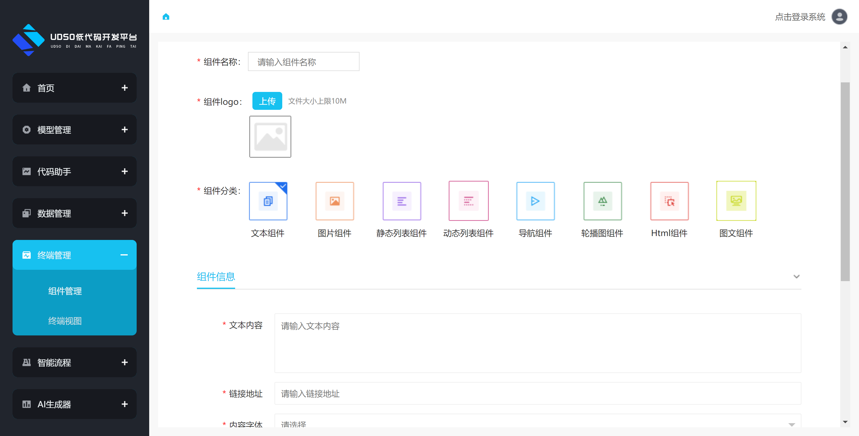 点击左侧菜单终端管理->组件管理->添加组件。进行跳转到添加组件页面