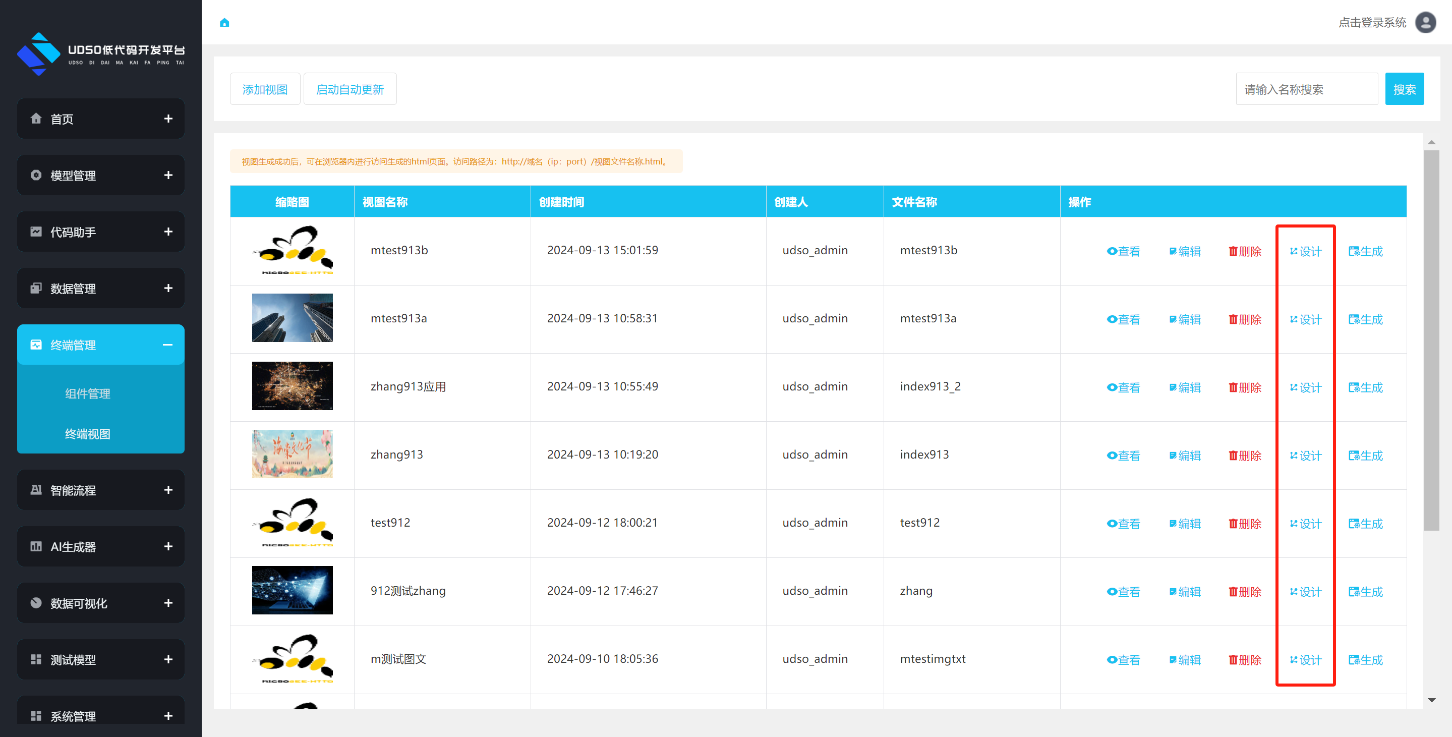 点击左侧菜单终端管理->终端视图。进行跳转到终端视图列表页面,点击数据操作栏中的设计按钮,进行设计视图页面跳转。