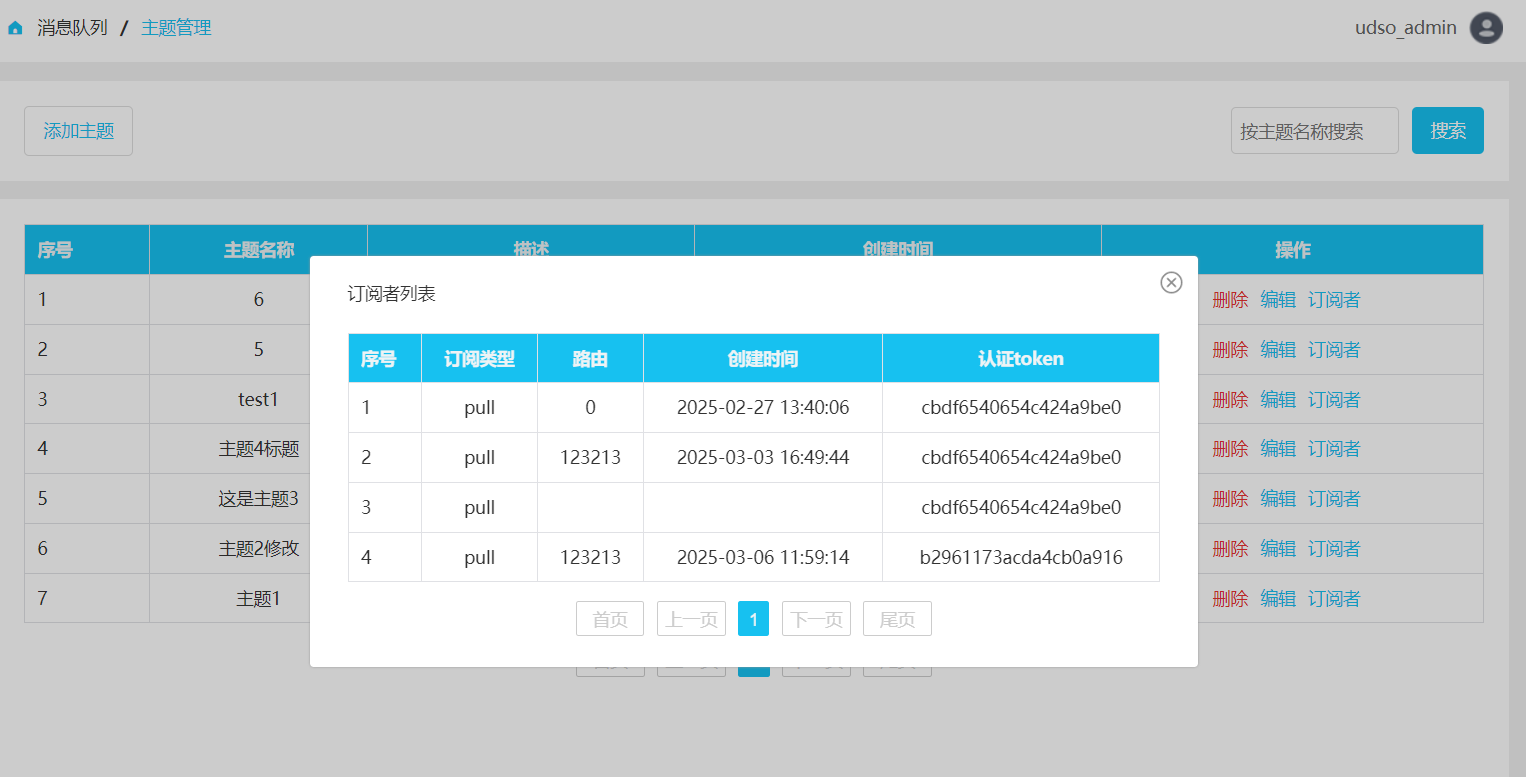 点击订阅者,弹框显示列表:序号、订阅类型、路由、创建时间及认证token。