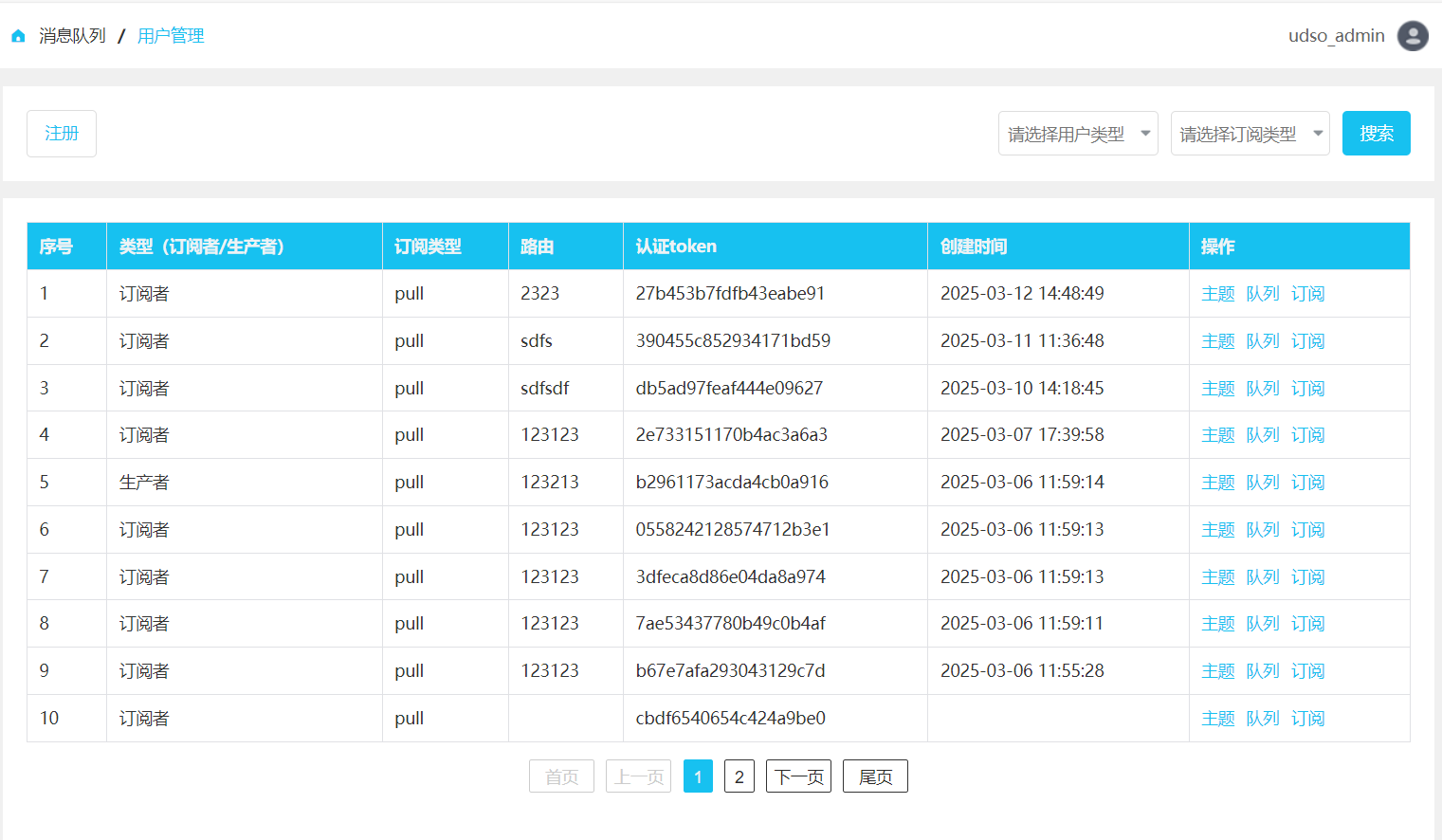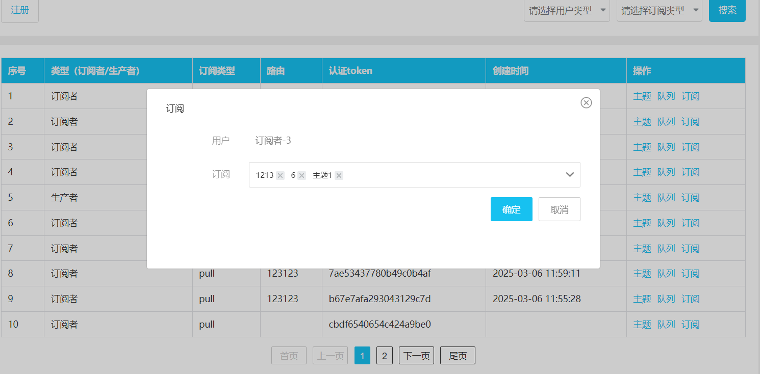 显示用户类型、订阅类型、路由、认证token、创建时间,操作栏:主题、队列、订阅。搜索栏可选择用户类型、订阅类型查询。