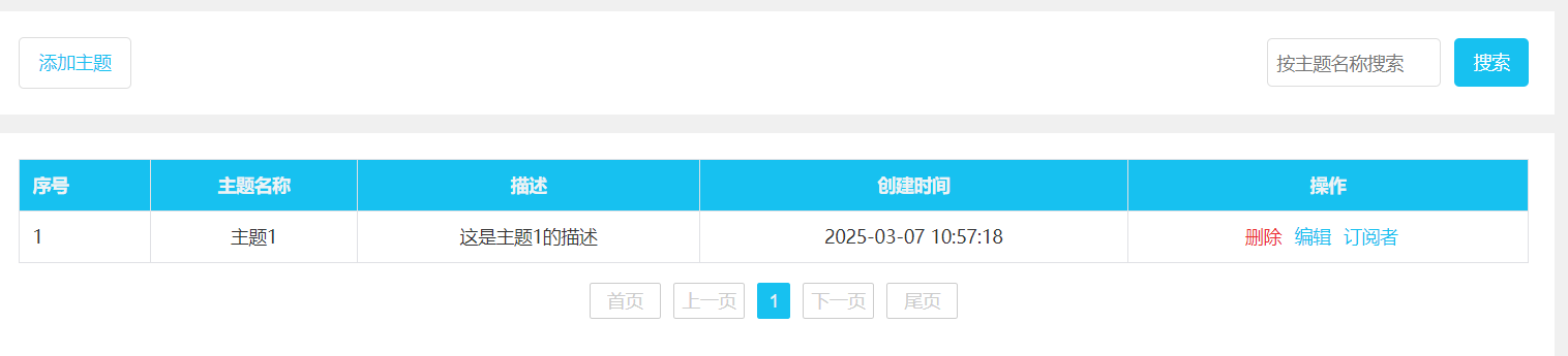显示主题名称、描述、创建时间,操作栏:删除、编辑、查看订阅者。搜索栏可根据主题名称模糊查询。