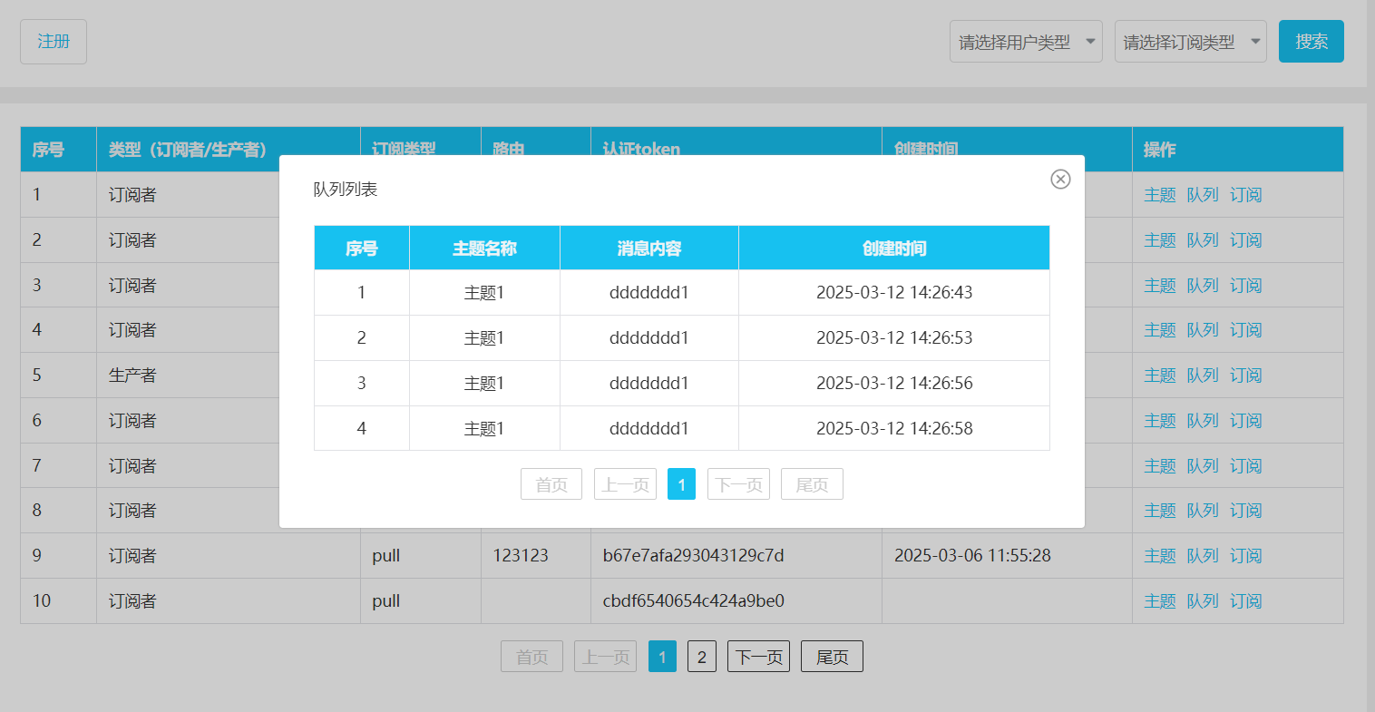 点击队列按钮,弹框显示列表,显示该用户的所有消息:序号、消息体、创建时间、主题名称。
