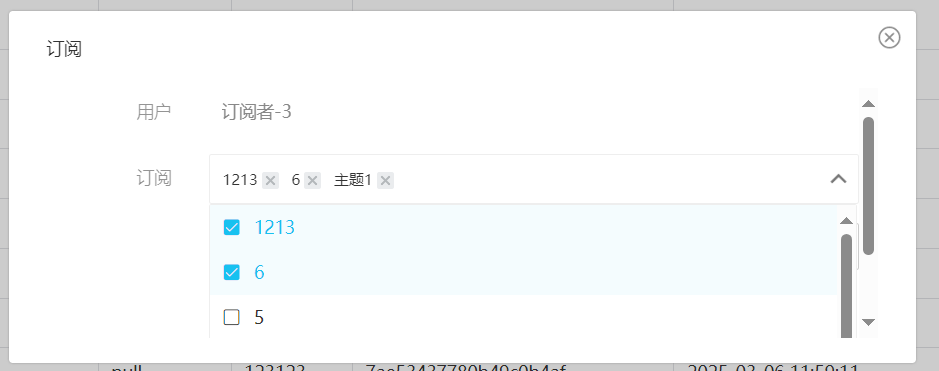 点击订阅按钮,弹框显示该用户及以主题名称为下拉的列表,用户可进行多选主题进行订阅。